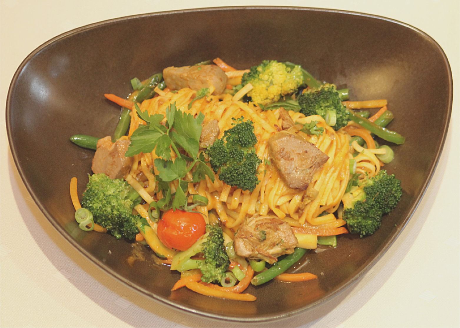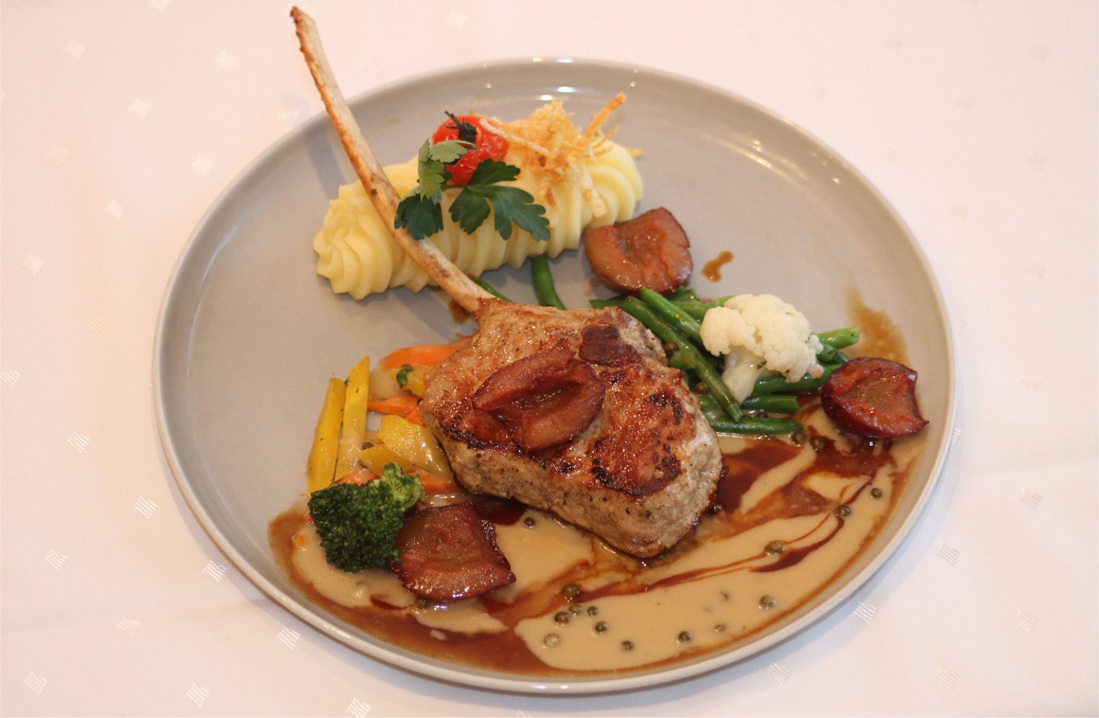 ... mit Apfelfüllung, hausgemachten Kartoffelknödel, karamellisierten Maronen, leckerem Cassisrotkraut,